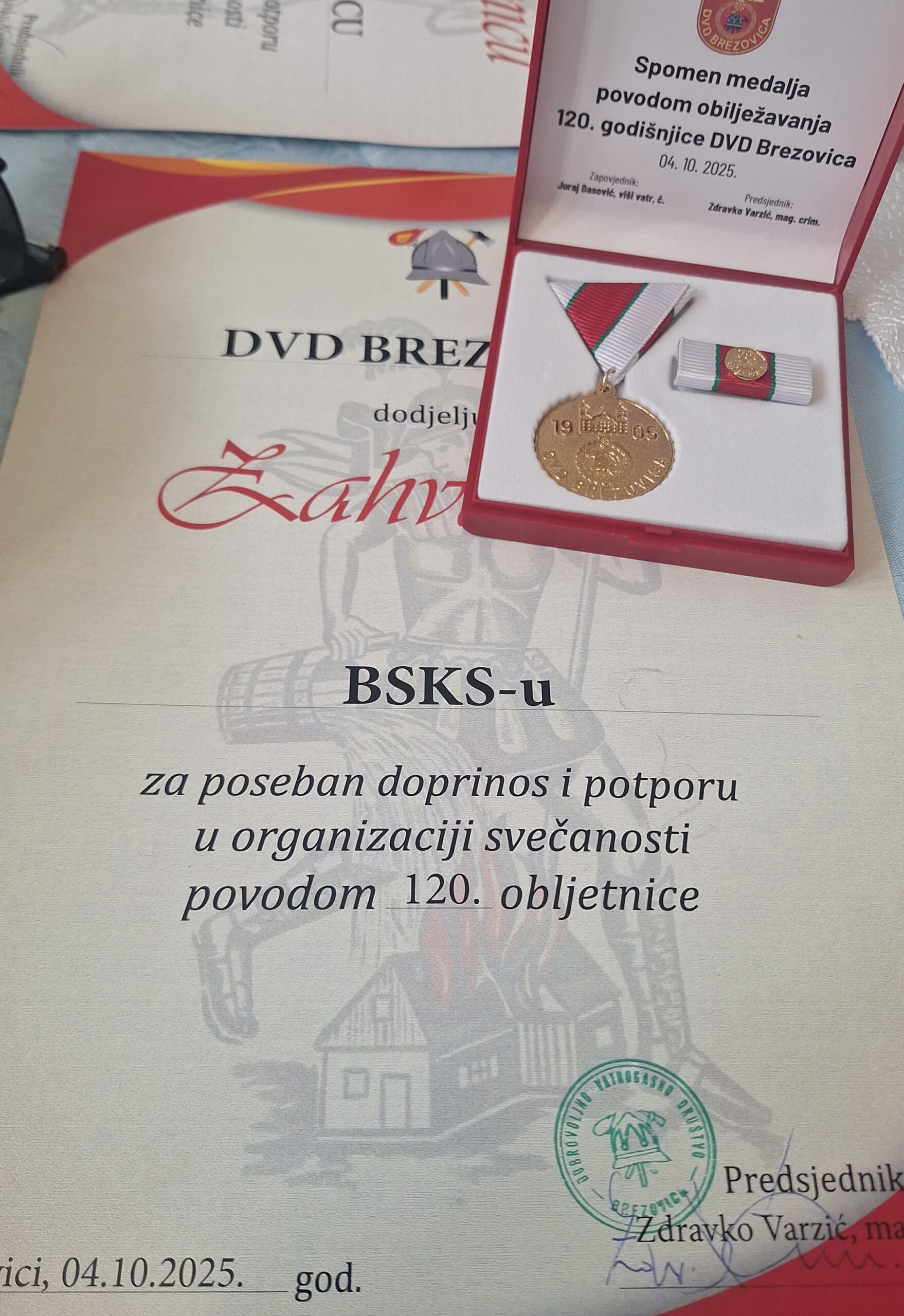 Tijekom svečanosti, DVD Brezovica dodijelio je BSKS-u zahvalnicu i spomen-medalju za poseban doprinos i potporu u organizaciji obilježavanja 120. godišnjice djelovanja društva.